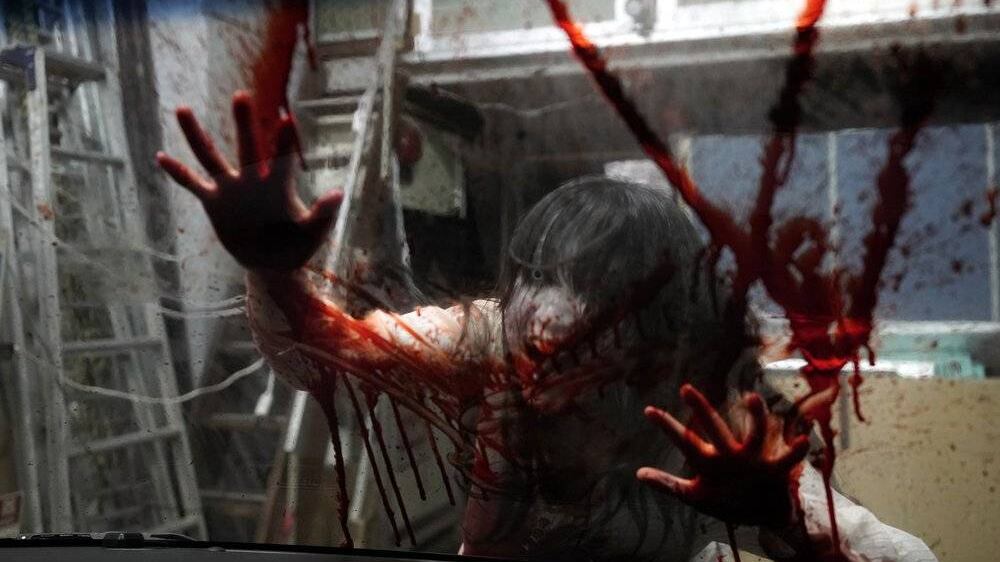 Zombies atacan vehículos, echándole sangre artificial. Pero los clientes dentro de los autos están separados y a salvo de sus perseguidores por la ventana.