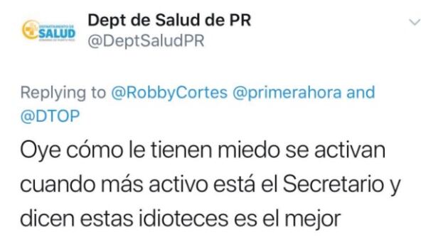 Un fotuto bien, pero bien, pero que bien bruto usó la cuenta del Departamento de Salud para responder con babosadas un tuit del gran revolucionario mediático Robby Cortés. Sí, la gran jugada tuitera de este espécimen fotutero consistió en confundir su responsabilidad laboral en las redes gubernamentales con una cuenta de jodedera en la que se dedica a inyectar la bacteria del fanatismo político.