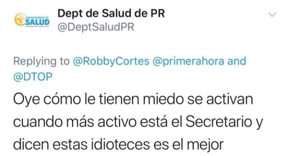 Un fotuto bien, pero bien, pero que bien bruto usó la cuenta del Departamento de Salud para responder con babosadas un tuit del gran revolucionario mediático Robby Cortés. Sí, la gran jugada tuitera de este espécimen fotutero consistió en confundir su responsabilidad laboral en las redes gubernamentales con una cuenta de jodedera en la que se dedica a inyectar la bacteria del fanatismo político.