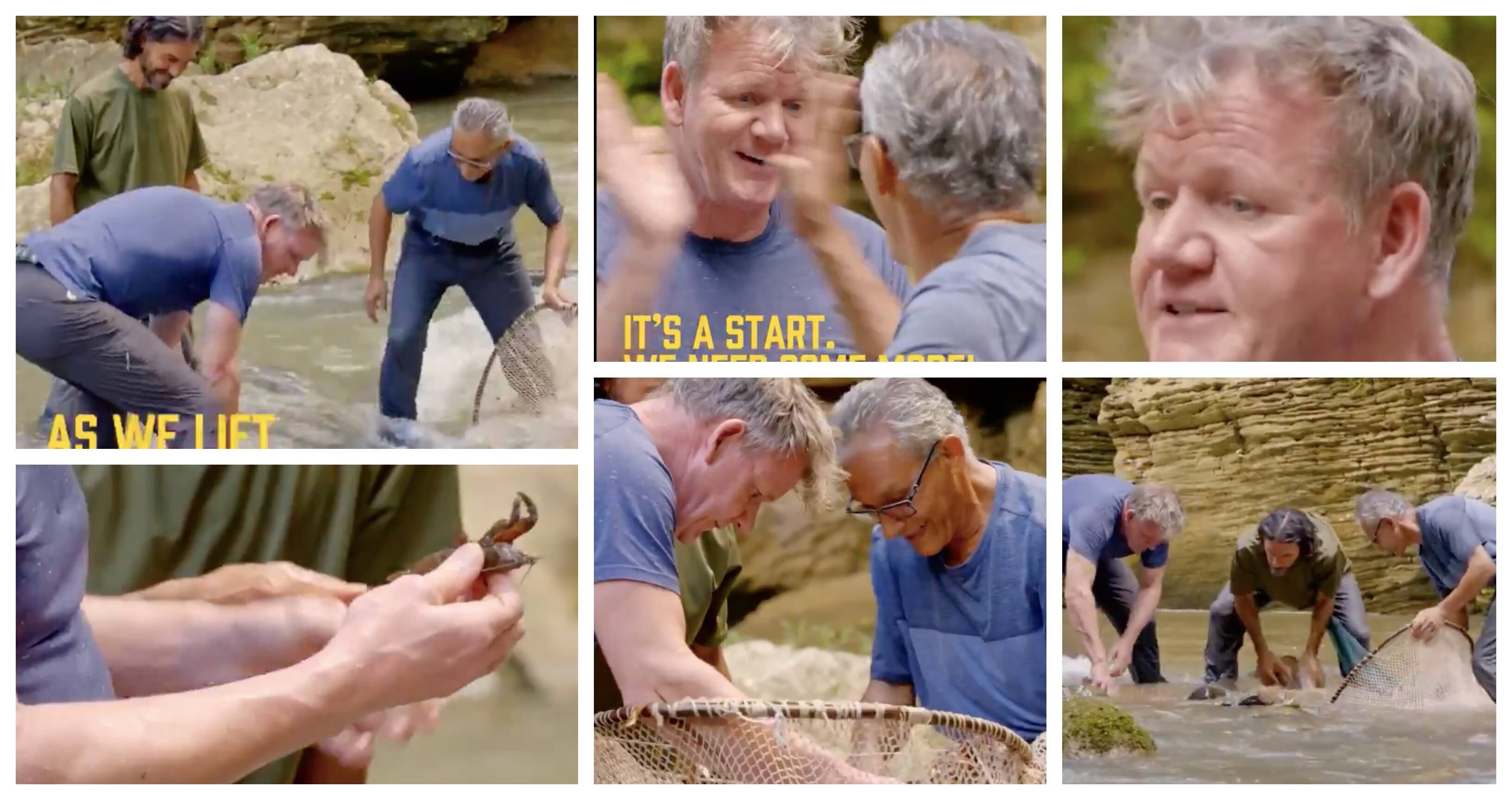 Sí, Ramsey, cuyos hobbies, además de cocinar incluyen ser un buly con los que participan en sus reality shows, se mostró muy humilde en las frías aguas de la Cordillera Central de Borinquen, cuando, junto a dos hombres nativos de la zona, se puso a buscar camarones debajo de piedras en una quebrá cualquiera.