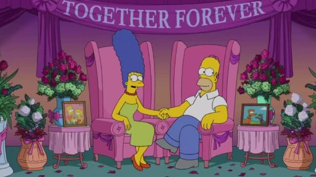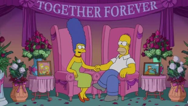 Incluso, para enfatizar el mensaje, la pareja Simpson luce ante la audiencia en un cálido escenario en el que domina un letrero con la leyenda “Together forever” (Juntos para siempre) y además hay arreglos florales y fotos familiares.