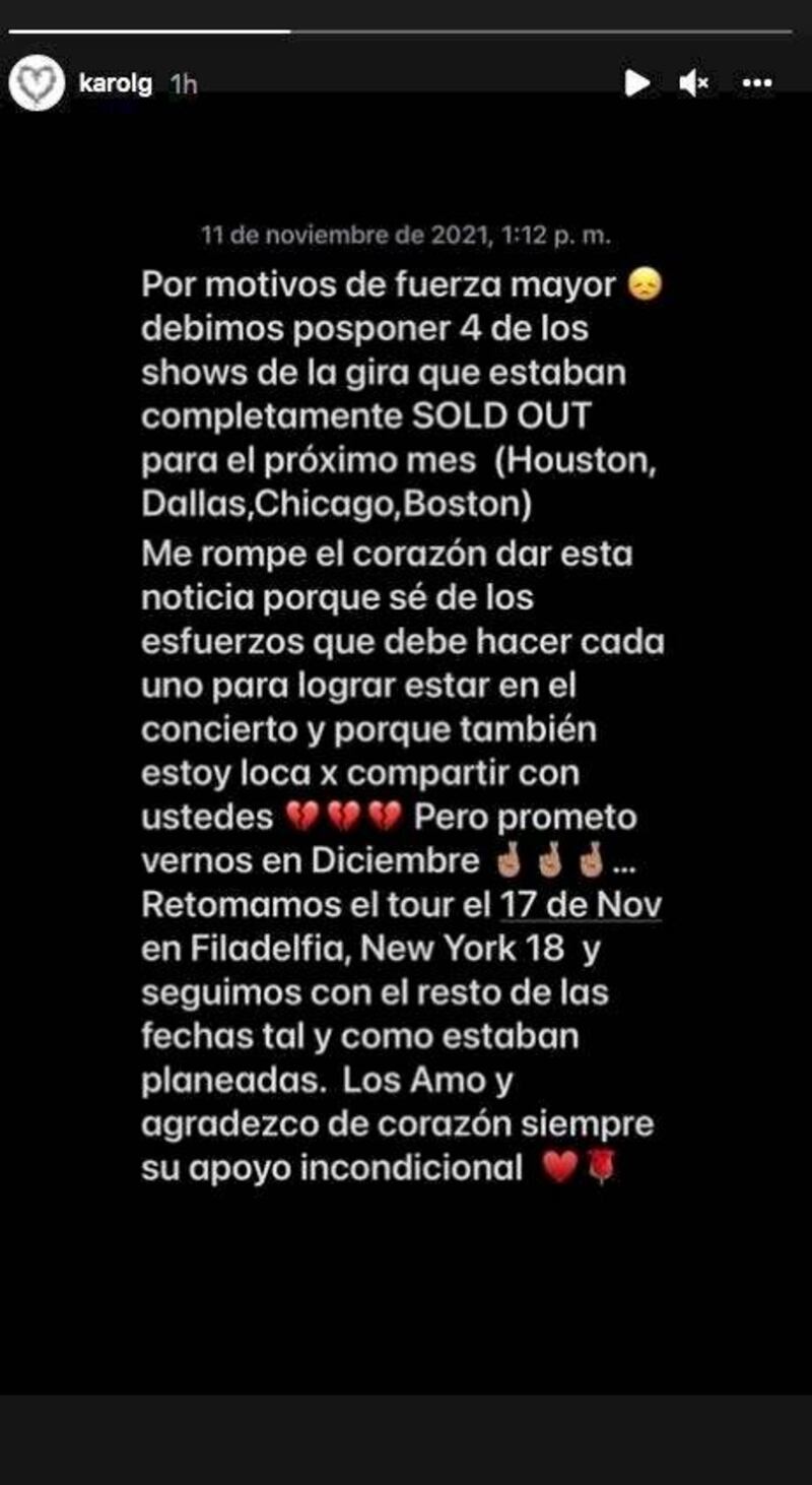 “Por motivos de fuerza mayor debimos posponer 4 de los show de la gira que estaban completamente SOLD OUT para el próximo mes (Houston, Dallas, Chicago, Boston). Me rompe el corazón dar esta noticia porque sé de los esfuerzos que debe hacer casa uno para lograr estar en el concierto y porque también estoy loca x compartir con ustedes. Pero prometo vernos en diciembre. Retomamos el tour el 17 de noviembre en Filadelfia, New York 18 y seguimos con el resto de las fechas tal y como estaban planeadas. Los amos y agradezco de corazón siempre su apoyo incondicional”, escribió Karol G en su Instagram.