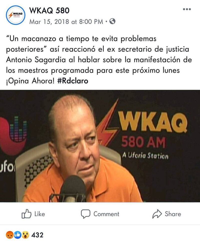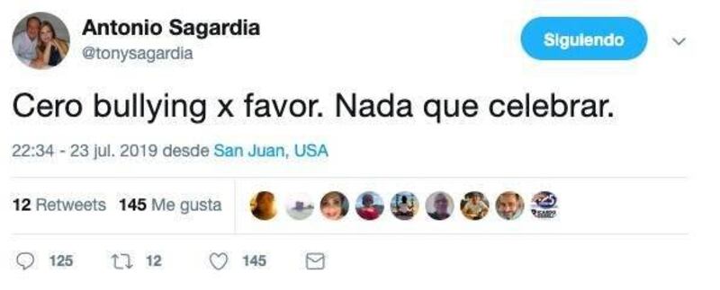 El exsecretario del Departamento de Justicia, Antonio Sagardía, quien una vez clamó porque le entraran a macanazos a los manifestantes, le rogó a través de Twitter al pueblo de Puerto Rico que dejen quieto ya al nene de Maga y Pedro, cuya renuncia de la Gobernación ya parece inminente.