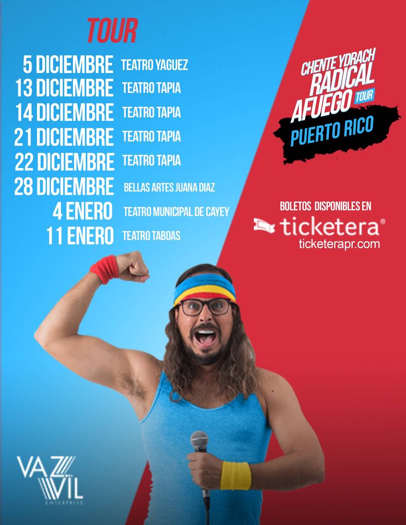 Chente Ydrach anuncia las fechas del cierre de su gira “Radical Afuego” que inició en el mes de julio en el estado de Florida. El comediante puertorriqueño presentará su stand up comedy el 5 de diciembre en el Teatro Yagüez en Mayagüez, el 13, 14, 15, 21, 22 de diciembre en el Teatro Tapia en San Juan y el 28 de diciembre en el Centro de Bellas Artes de Juana Díaz.