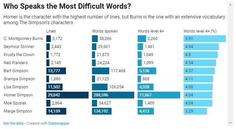 Homero Simpson es el que posee mayor número de líneas. Sin embargo, el Señor Burns es el que posee el vocabulario más extenso.
