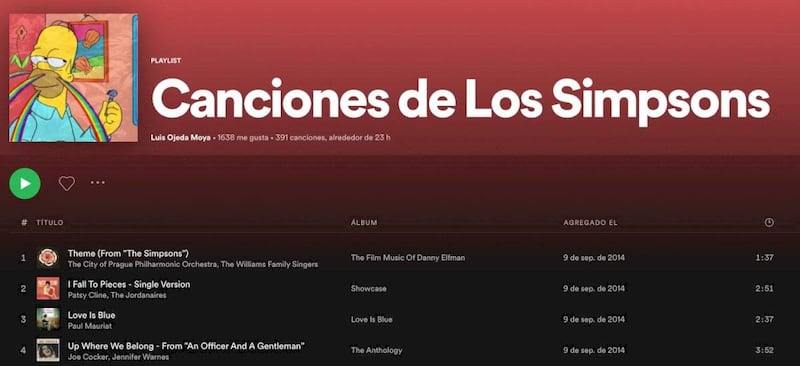 La lista fue creada por Luis Ojeda Moya y se llama simplemente “Canciones de Los Simpsons”