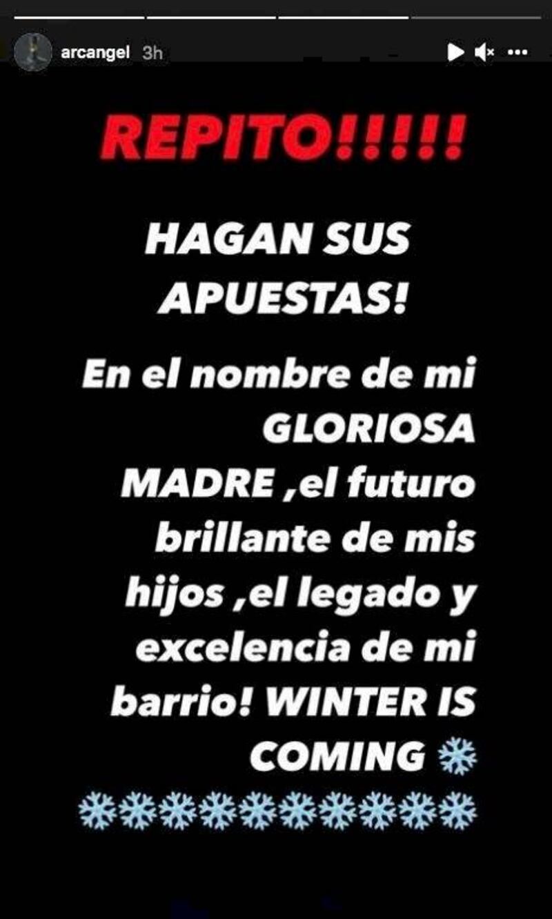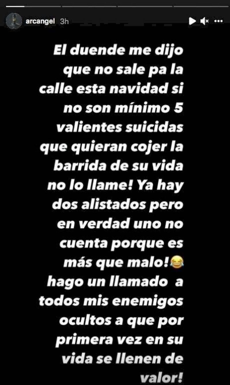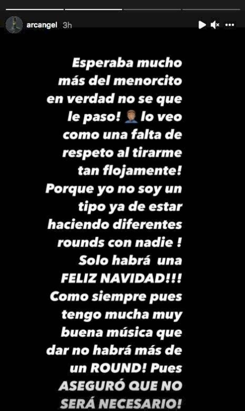 “Esperaba mucho más del menorcito en verdad no se que le pasó! Lo veo como una falta de respeto al tirarme tan flojamente Porque yo no soy un tipo ya de estar haciendo diferentes rounds con nadie! Solo habrá una FELIZ NAVIDAD!!! Comi siempre pues tengo mucha buena música que dar no habrá más de un ROUND! Pues aseguro que no será necesario (sic.)”, escribió Arcángel en su Instagram.