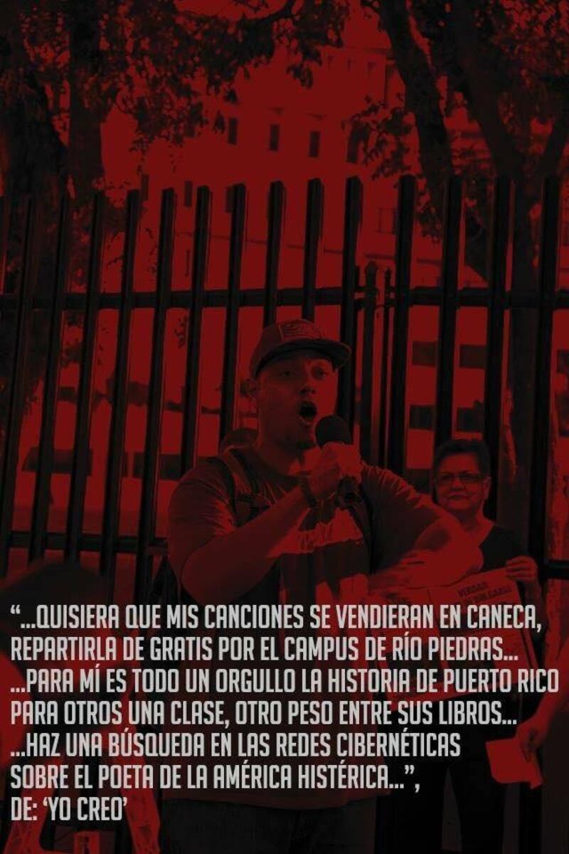 Luis Díaz: La expresión que se desprende de mis versos, se desprende desde lo más profundo de mi ser. Podemos llegar a la conclusión de que lo que yo escribo es básicamente una expresión de lo que el sentimiento colectivo me va dando y lo que yo puedo recoger de lo que para mí es la situación [de Puerto Rico]. Yo me alimento de to’ eso. Cada cosa que yo hago tiene que ver con mi momento histórico, el que yo estoy viviendo y lo que yo estoy procesando. Y cómo yo lo vivo y cómo yo lo sobrevivo. Un poquito de mí y un poquito de lo que yo pienso que es la lucha social.