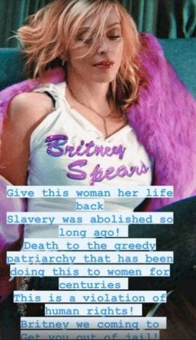 “Devuélvanle la vida a esta mujer. ¡La esclavitud fue abolida hace tanto tiempo! Muerte al codicioso patriarcado que ha estado haciendo esto con las mujeres durante siglos. ¡Esto es una violación de los derechos humanos! ¡Britney, vamos a sacarte de la cárcel!, publicó la Chica Material.