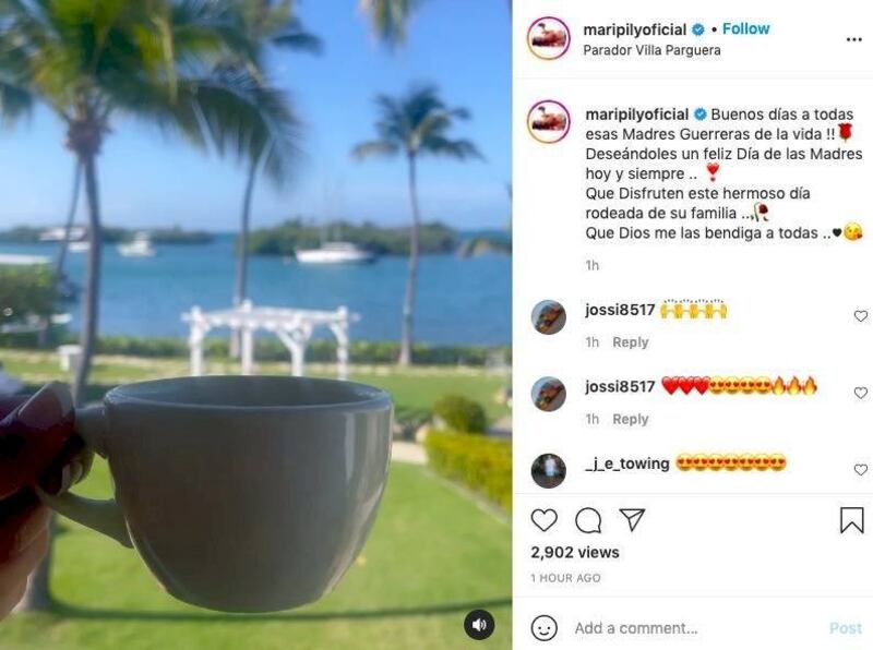 “Eres la mejor Madre del mundo, extraño tenerte hoy y siempre conmigo . daría lo que fuera por sentir un abrazo tuyo un día como hoy. Te amo inmensamente y extraño…”, escribió Maripily en Instagram. Maripily también dedicó su tacita de café mañanero a “todas esas madres guerreras”, interponiendo que hoy será un gran Día de las Madres para ella, quién goza de lo lindo desde hace unos días en La Parguera.