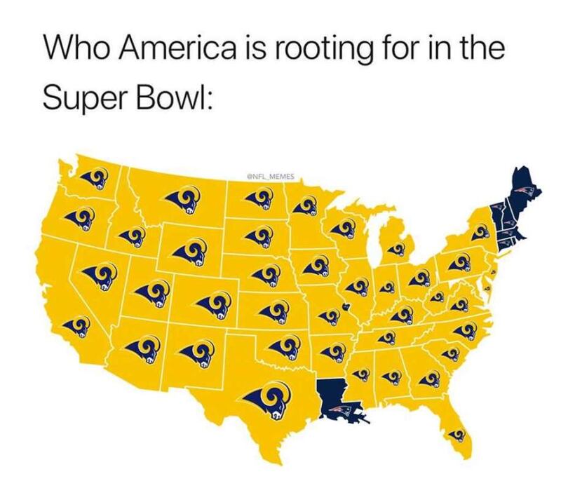 Otra de las bromas fue la cantidad de estados que supuestamente apoyan a los Rams, porque están aburridos de ver ganar a los Patriots.