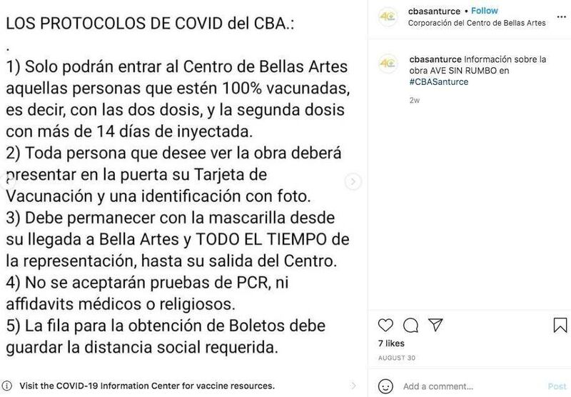 El Centro de Bellas Artes publicó en su página de Facebook un anuncio sobre las obras de Teatro que se presentarían e indicó que al ser un Teatro del Estado se tienen que dejar llevar por la Orden Ejecutiva del gobernador Pedro Pierluisi y las directrices del gobierno federal por lo que solo estarían aceptando personas con evidencia de vacunación y utilización de mascarilla en todo momento.