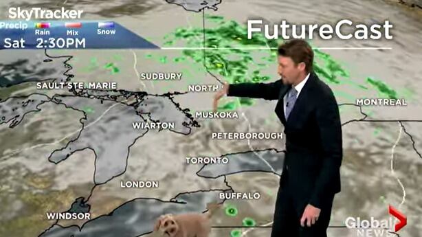 Anthony Farnell daba el reporte climatológico en el canal Global News en Canadá cuando apareció su can, llamado Storm (tormenta en inglés) a pedirle comida.