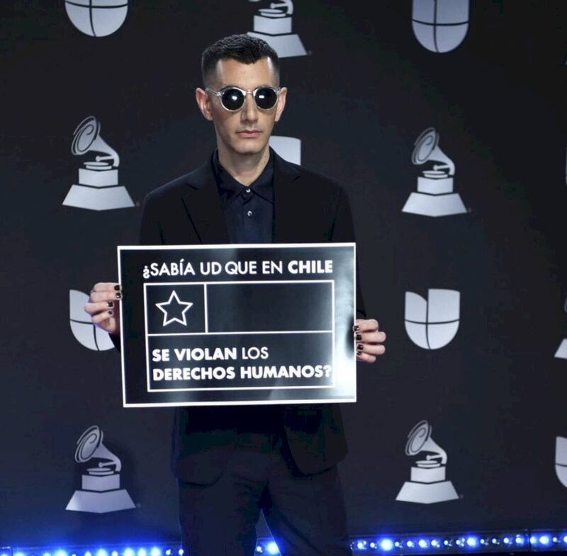 Pero Laferte no fue la única es realizar acciones de protesta: de hecho, el músico cineasta Alex Anwandter se presentó en la alfombra roja con este cartel.