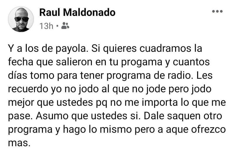 “Y a los de payola. Si quieres cuadramos la fecha que salieron en tu programa y cuantos días tomo para tener programa de radio. Les recuerdo yo no jodo al que no jode pero jodo mejor que ustedes pq no me importa lo que me pase. Asumo que ustedes si. Dale saquen otro programa y hago lo mismo pero a que ofrezco más”, posteó.