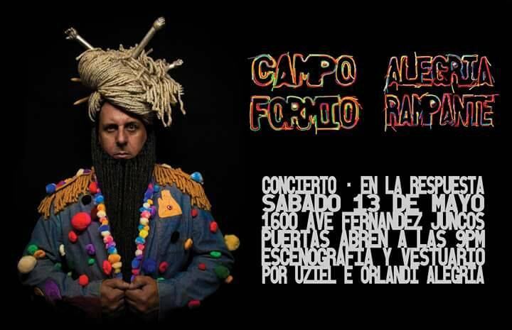 Alerta a todos los fanáticos y seguidores del rock nacional. Este sábado, 13 de mayo de 2017, se presentarán juntos en La Respuesta en Santurce dos de las agrupaciones líderes del movimiento musical independiente en Puerto Rico: Alegría Rampante y Campo-Formio. Por la vida. Por la devastación. Por el país. ¡Por el RAWK!