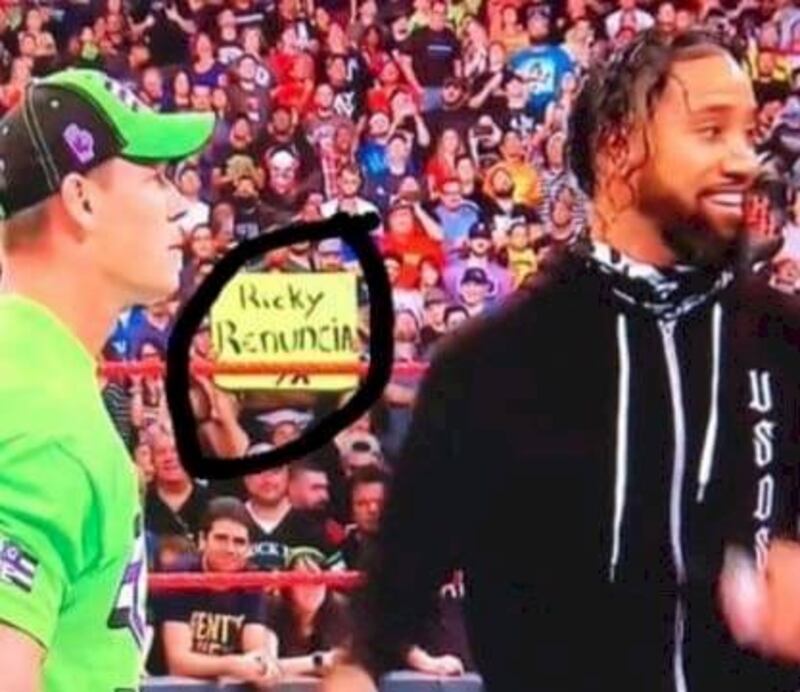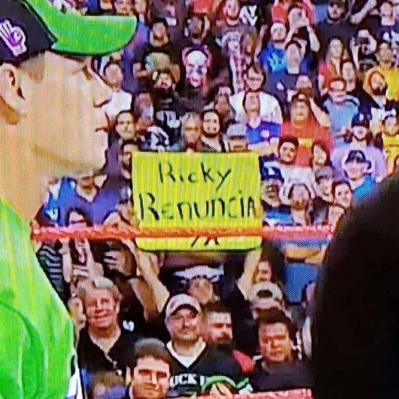 No se sabe quién fue el gran prócer que llegó anoche con una cartulina que leía Ricky Renuncia a la función de Monday Night Raw en Tampa, Florida, una ciudad cundido de boricuas hasta las tetas.