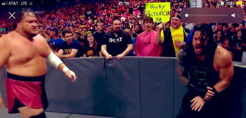 Lo que sí es que la persona estaba bien al frente y su letrero salió a to lo que da. Salió con John Cena, con los Usos, con Samoa Joe y con Roman Reigns. Chequea las imágenes que recorren el internet.
