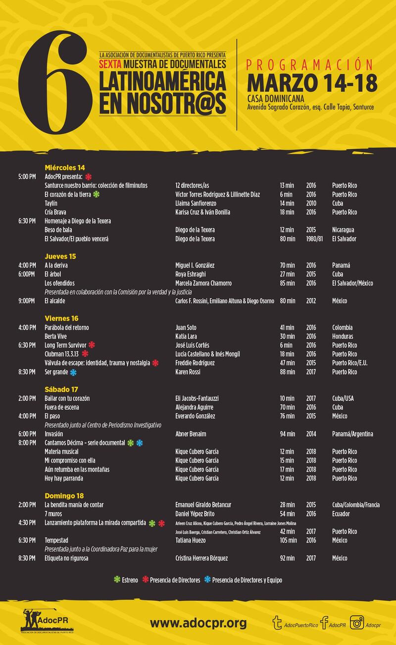 El documental centroamericano será protagonista de la 6ta muestra de cine documental Latinoamérica en Nosotr@s, organizada por la Asociación de Documentalistas de Puerto Rico, a celebrarse del 14 al 18 de marzo de 2018 en la Casa Dominicana, ubicada en la Ave. Sagrado Corazón, esquina Calle Tapia en Santurce.