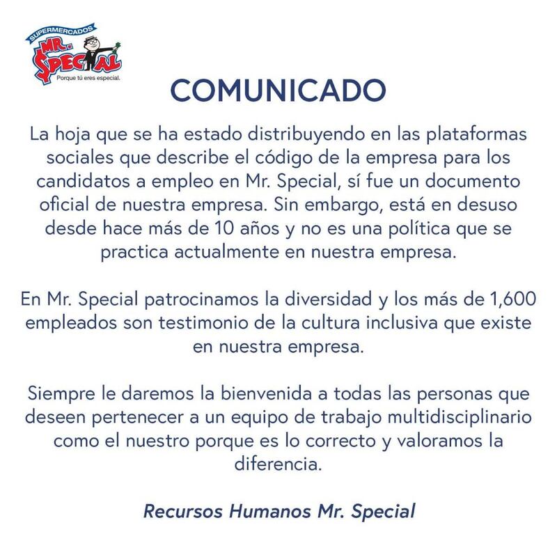 La cadena de Supermercados Mr. Special, se expresó a través de un comunicado oficial sobre una carta que corrió a través de las redes sociales en el cual exigían a las personas que fueran a una entrevista de trabajo con un código de vestimenta especial.
