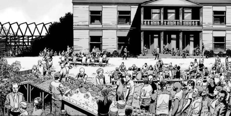 Algunas otras tomas interesantes de la imagen promocional son los zombies con las manos esposadas y el plato de un satélite. Hay que destacar que los zombies son utilizados como armas en varias ocasiones en los cómics, especialmente por Negan. Además, vemos a Morgan montado en un caballo, esto no solo porque esto se convierte en una forma común de transporte para nuestros personajes de los cómics, sino porque el Morgan de los cómics murió cuando los caminantes invadieron Alexandria. Según su aparición aquí, este no será el caso.