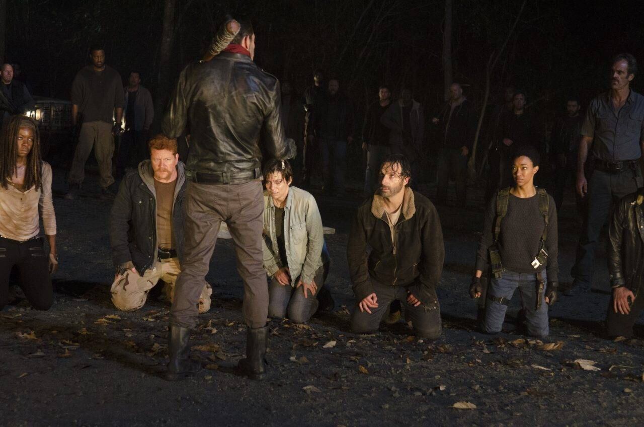 La imagen muestra (de derecha a izquierda) a Glenn, Rosita, Daryl Dixon, Michonne, Abraham, Maggie, Negan, Rick Grimes, Sasha, Aaron, Carl y Eugene.