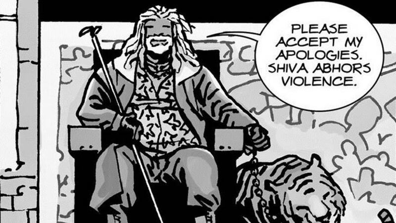 Ezekiel, para quién no conozca este personaje, es el líder de otra comunidad cercana a Alexandria llamada The Kingdom. Ezekiel lleva siempre a su lado una mascota, un tigre llamado Shiva. En el penúltimo capítulo vimos como un miembro de esta comunidad de supervivientes ayudaba a Morgan y a Carol, este hombre llevaba una armadura como las que suelen llevar los miembros del 'El Reino’.