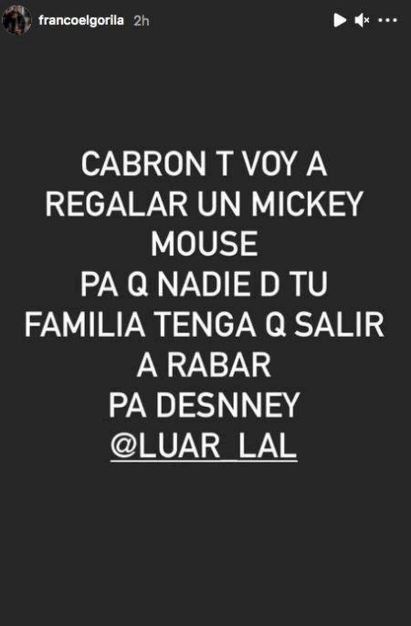 Estos chamaquitos (y no tan chamaquitos) de ahora lo que hacen es tirarse por Instagram y no probándose con música como lo hacían antes. La tiraera más reciente y una de las más mongas es la de Franco “El Gorilla” contra Luar La L, el hijo de Raúl Armando y Brenda Robles. (Protagonistas de los chismes de La Comay en los 90 y 2000).