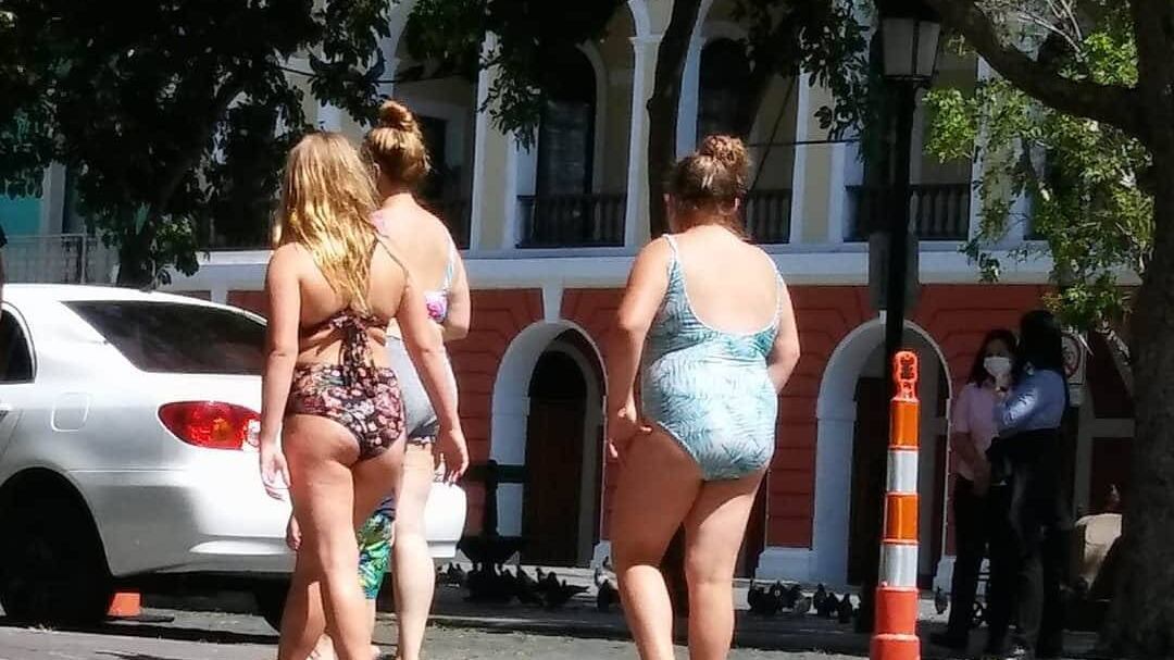 A través de las redes sociales, corre una foto de estas tres personas paseándose por el Viejo San Juan en traje de baño. Algo parecido a lo que vimos esta misma semana con otras turistas que también enseñaron sus carnes en The Mall Of San Juan.