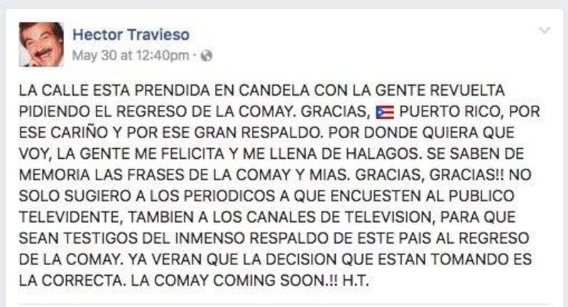 Desde que don Héctor Travieso descubrió el Facebook live, la vida de decenas de boricuas no es la misma. El fiel lazarillo de La Comay cada día anuncia que “SuperXclusivo” vuelve a la televisión, y aunque no da detalles de dónde o cuándo regresan, los fanáticos del programa de chismes están esperando con ansias.