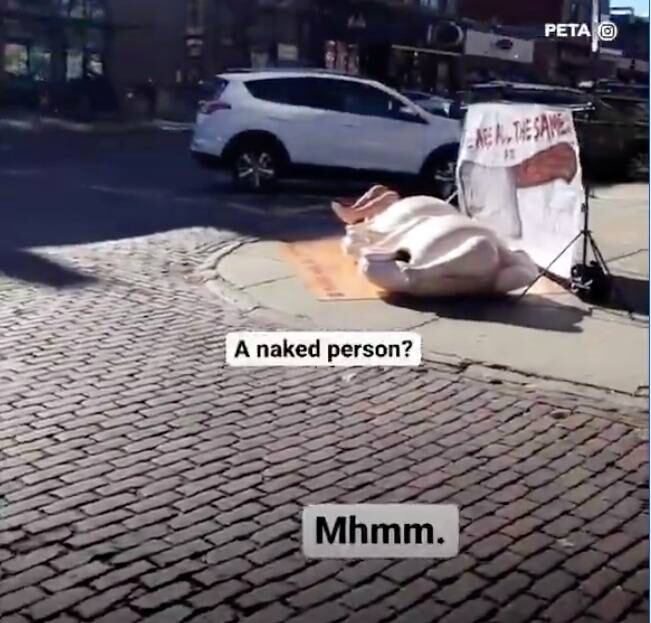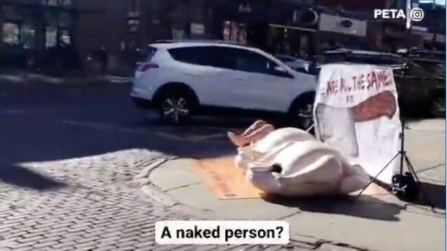 El video fue publicado por la organización y en el mismo se puede ver cómo la gente se espanta al ver al hombre desnudo que trataba de llevar el mensaje de que los seres humanos y los animales sufren igual.