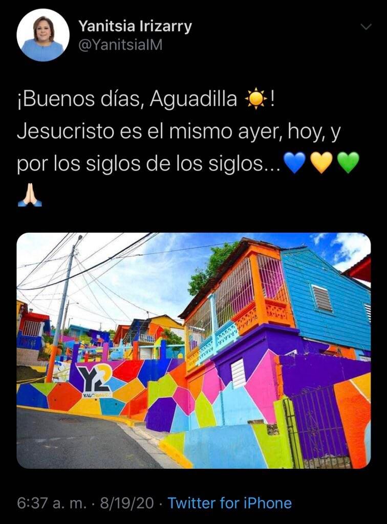 La EXPERTA en el manejo de fondos ARRA durante el cuatrienio de Luis Fortuño parece que confunde las cositas visuales, porque en vez de tuitiar esta mañana unos buenos días para Aguadilla usando una imagen de un paisaje de ese pueblo, se equivocó y posteó una de Yauco.