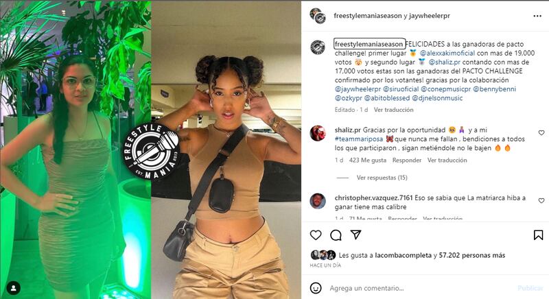 El segundo lugar se lo llevó otra boricua Shaliz quien lleva pa’l de tiempo haciendo música y rapeando.