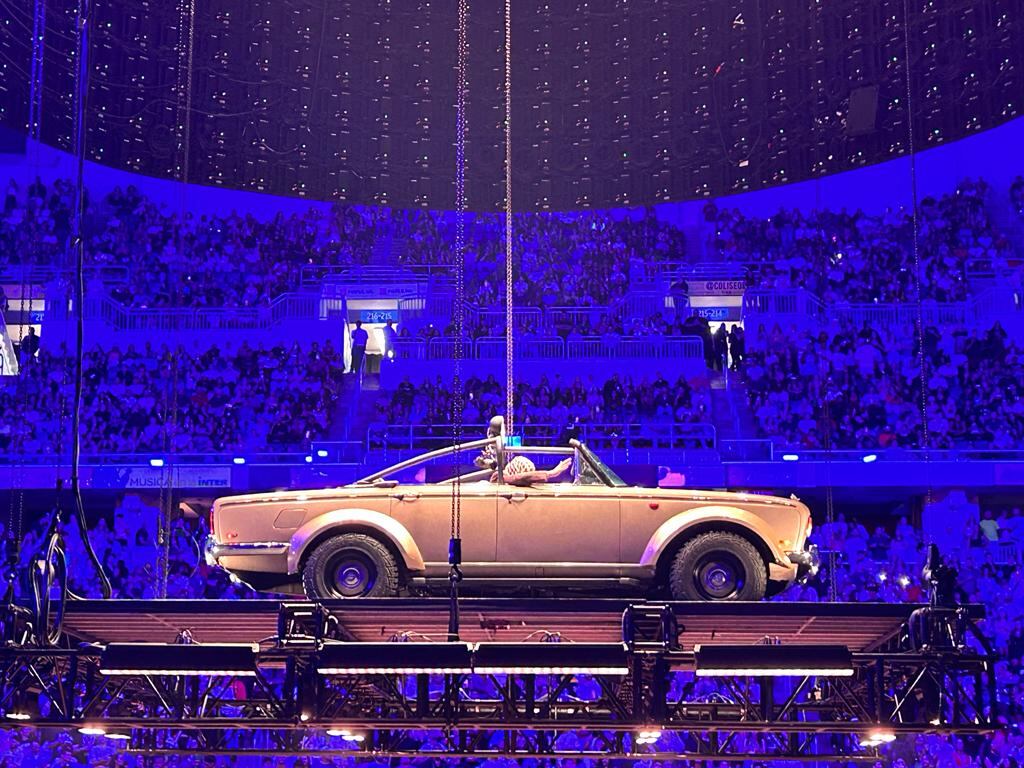 El vehículo continuaba bajando del centro del coliseo con el artista en su interior para comenzar el tema “Mónaco” que es el sencillo principal del álbum. Posteriormente comenzó el tema “Fina” con la primera aparición sorpresa, se trata de Young Miko, quien también estaba presente en el escenario cercano a la tarima.
