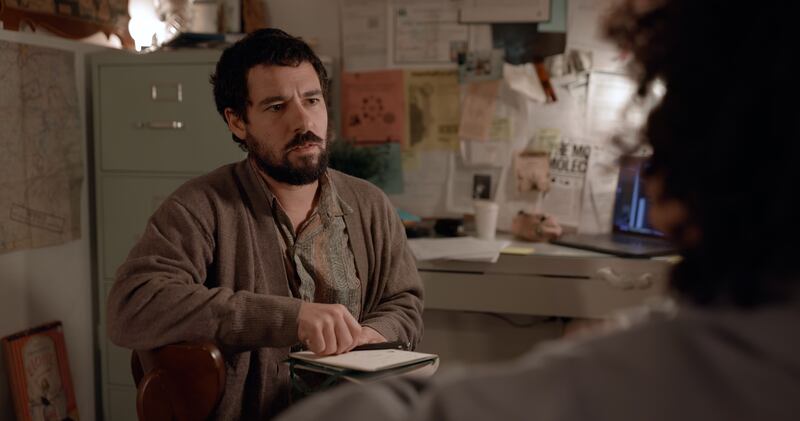 Juan Botta como el doctor Lorenzo Piovanetti frente a un escritorio y sujetando una libreta frente a Vei Habache.