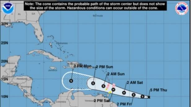 El Centro de Huracanes señaló que los habitantes de las islas de Barlovento deben estar pendientes de la tormenta porque está previsto que se acerque a la zona el viernes en la noche y el sábado. Se pronostica que adquirirá un poco de fuerza, por lo que aún existe la posibilidad de que se convierta en huracán, pero se prevé que se debilitará conforme ingrese al mar Caribe.