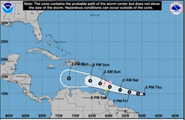 El Centro de Huracanes señaló que los habitantes de las islas de Barlovento deben estar pendientes de la tormenta porque está previsto que se acerque a la zona el viernes en la noche y el sábado. Se pronostica que adquirirá un poco de fuerza, por lo que aún existe la posibilidad de que se convierta en huracán, pero se prevé que se debilitará conforme ingrese al mar Caribe.