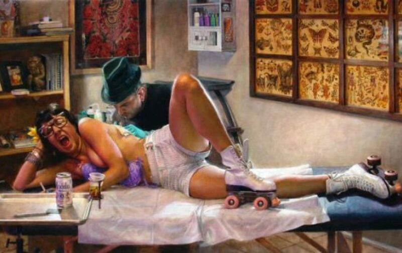 El artista del tatuaje Sergio Sánchez también se mueve entre la pintura y el tatuaje. Aquí el retrata un estudio de tatuajes en la obra ‘No Pain, No Gain’. Foto: Especial. Imagen Por: