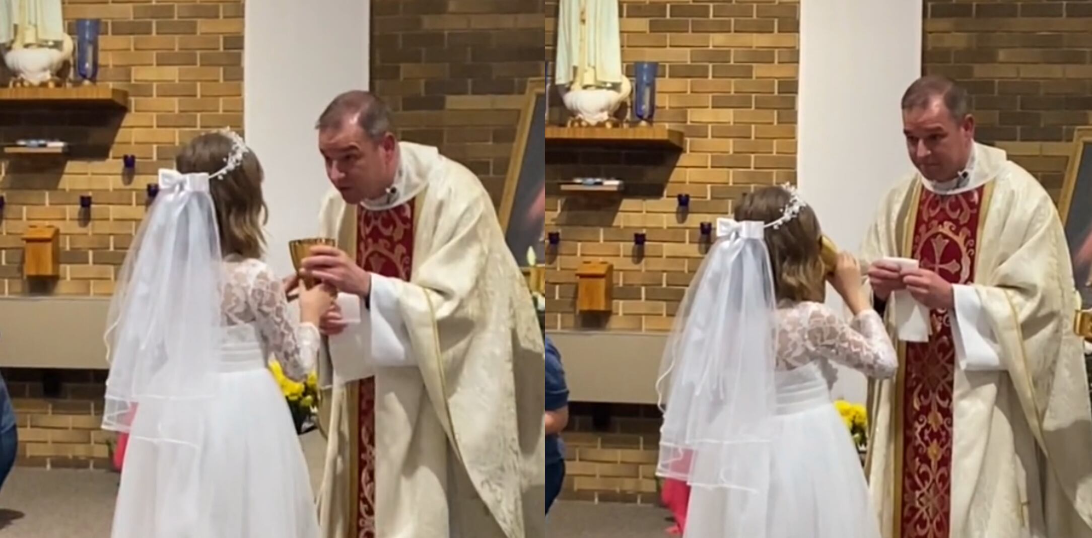 Varios usuarios en redes sociales han compartido el video de un gracioso momento en el cual se ve a una niña, al realizar la primera comunión, recibiendo la hostia y el vino consagrados por el sacerdote.
