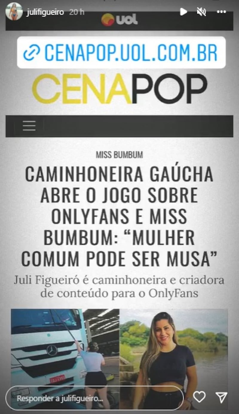 Impacto generó este jueves en Brasil la historia de Juli Figueiró, una mujer casada hace 12 años, y quien pasó de ser una conductora de camiones de carga a participar en el tradicional concurso local del Miss Bumbum y abrir una exitosa cuenta de OnlyFans.