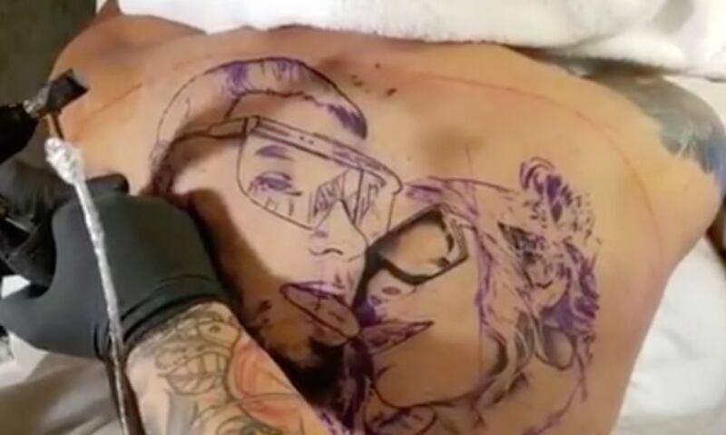 Después, Anuel se fue a lo grande y decidió plasmar una fotografía de ambos en su espalda.