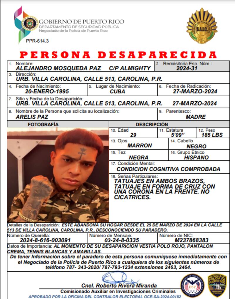 Ayer, martes, la madre Paz Rodríguez había realizado una querella en la Policía reportando a Almighty como desaparecido y que no sabía de él desde las 5:30 p. m. del domingo, 25 de marzo.