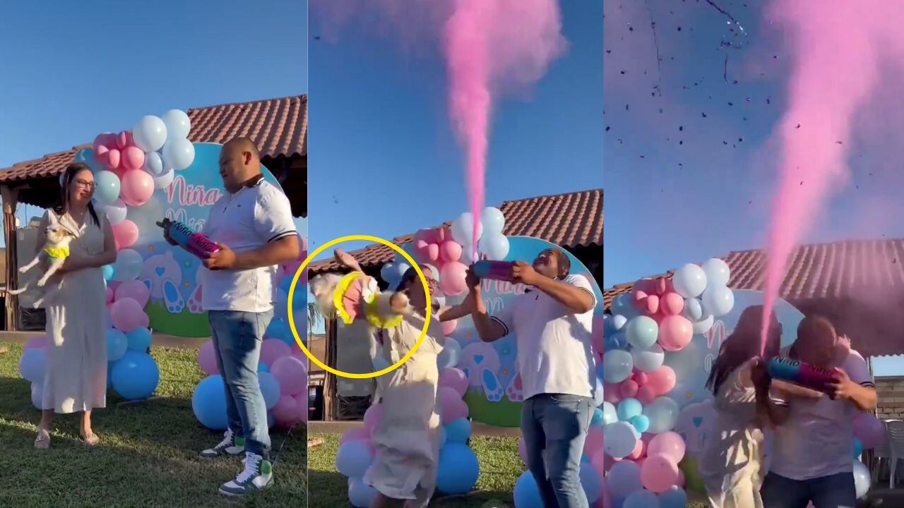 En el clip, de poco menos de 30 segundos, se puede ver cómo la pareja, junto a su mascota en brazos, estaba por abrir el tanque que expondría el sexo del nuevo integrante. El hombre, quien tenía el objeto, sacó el humo que fue de color rosa. La próxima madre, que no pudo con la emoción, lanzó al perrito.