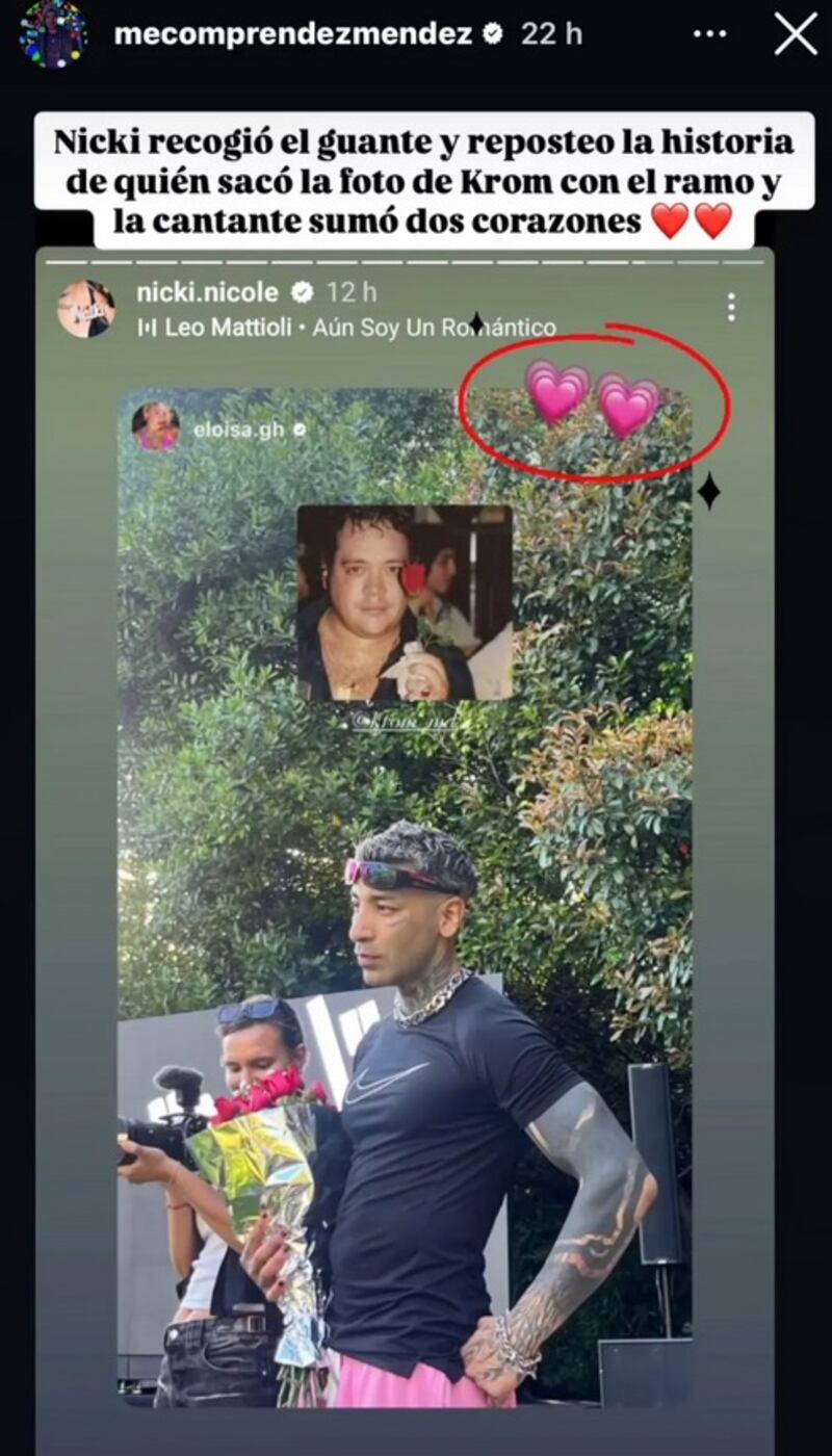 Además el periodista Gustavo Méndez señaló que en una foto que apareció Nicki con una rosa, esa flor justamente corresponde al ramo que porta Krom y que se lo habría regalado por el lanzamiento de su nuevo disco.