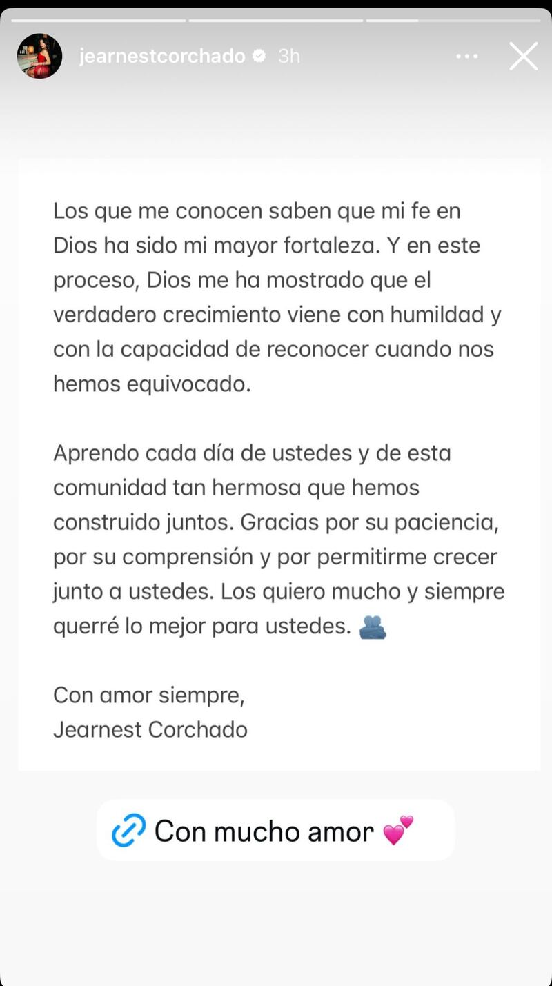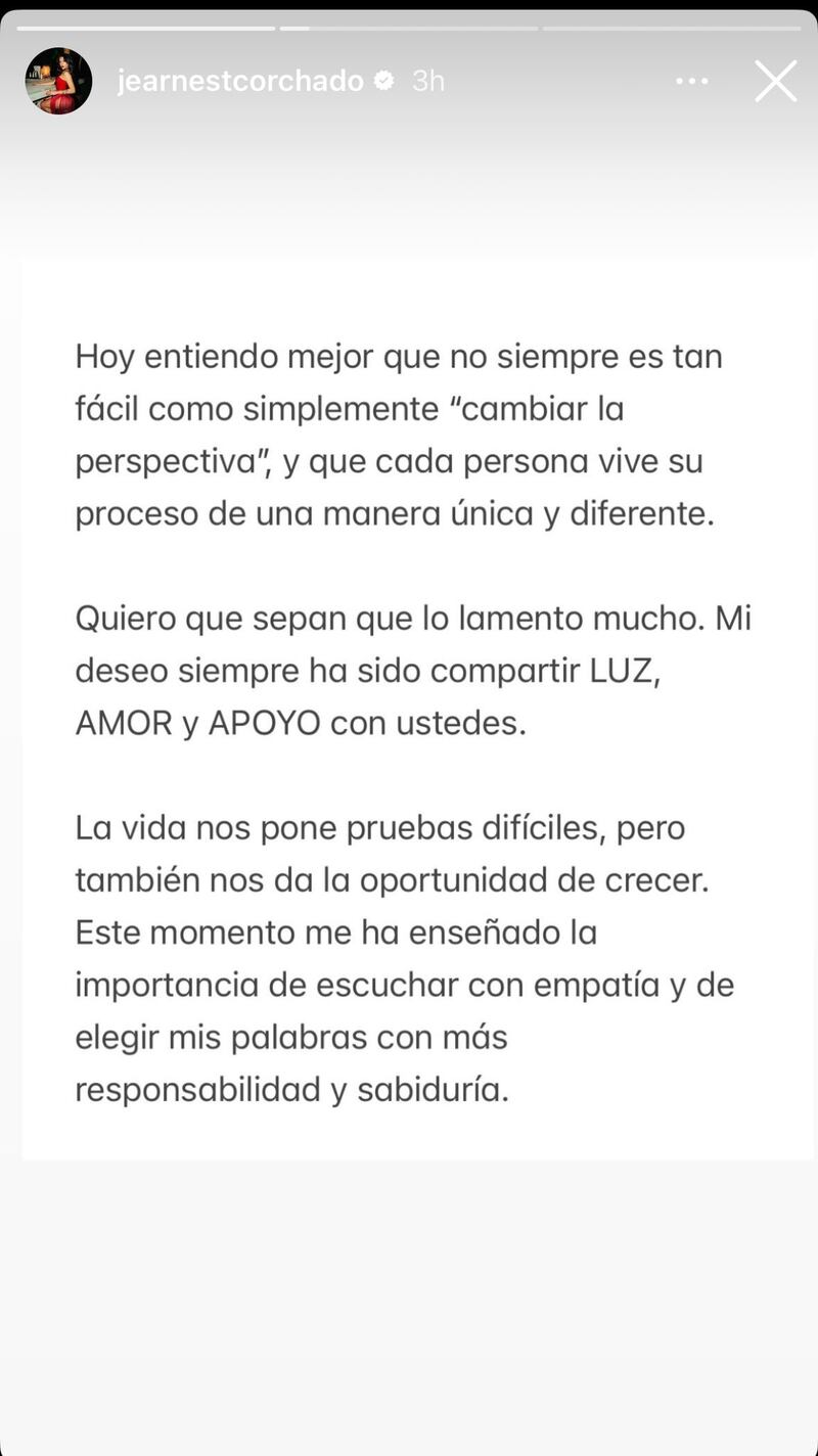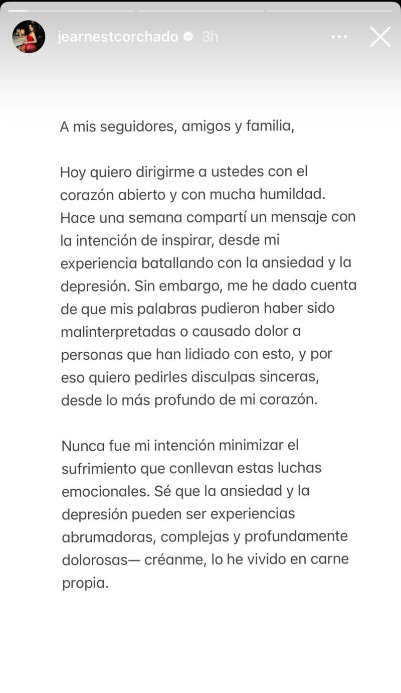 “Hace una semana compartí un mensaje con la intención de inspirar, desde mi experiencia batallando con la ansiedad y la depresión. Sin embargo, me he dado cuenta de que mis palabras pudieron haber sido malinterpretadas o causado dolor a personas que han lidiado con esto, y por eso quiero pedirles disculpas sinceras, desde lo más profundo de mi corazón”, escribió en sus redes sociales.