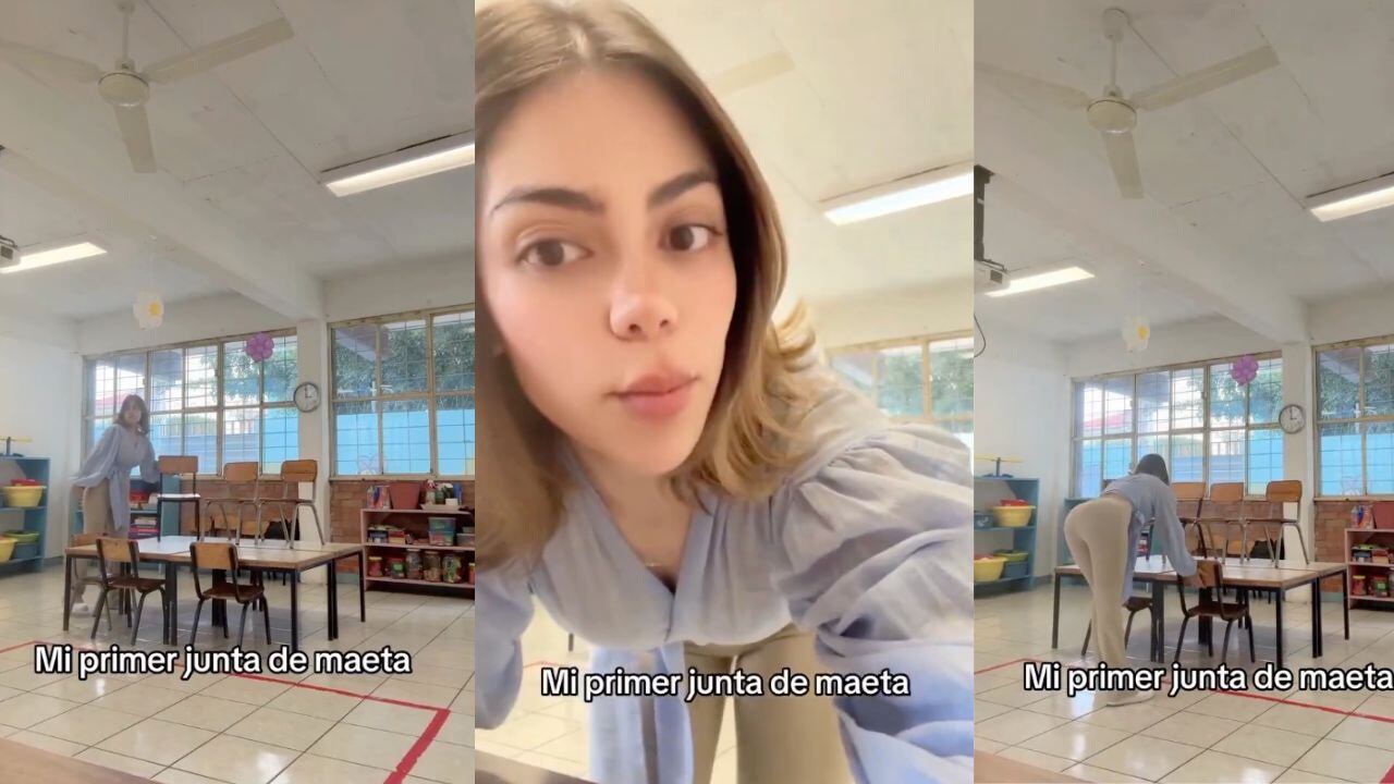 Con el texto “mi primer junta de maeta”, la docente comenzó a acomodar el aula para que las visitas pudieran estar más cómodas; lo que nunca imaginó fue que su outfit se robaría la atención de todo el internet.