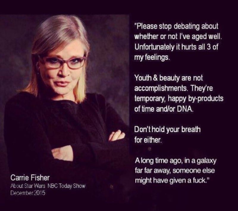 La muerte se la llevó antes de tiempo pero, Carrie Fisher siendo Carrie Fisher, ya estaba lista para recibirla, habiendo escrito su propio obituario en su libro Wishful Drinking, donde explicaba que George Lucas le prohibió usar ropa interior mientras grababa Star Wars, pues en el espacio el cuerpo humano se extendía y podía quedar ahogado por pantis y sostenes.