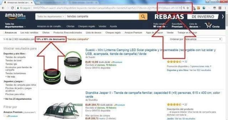 “Lo que haremos será poner en el buscador superior: “tienda de campaña” (o lo que estemos buscando). Nos aparecerán miles de resultados, pero a nosotros lo que nos interesan son los que están rebajados, para eso vamos copiar el código: &pct-off=10-99 al final de la larguísima dirección que nos aparece arriba. Así solo se mostrarán los artículos con un descuento entre el 10% y el 99%”, explican.