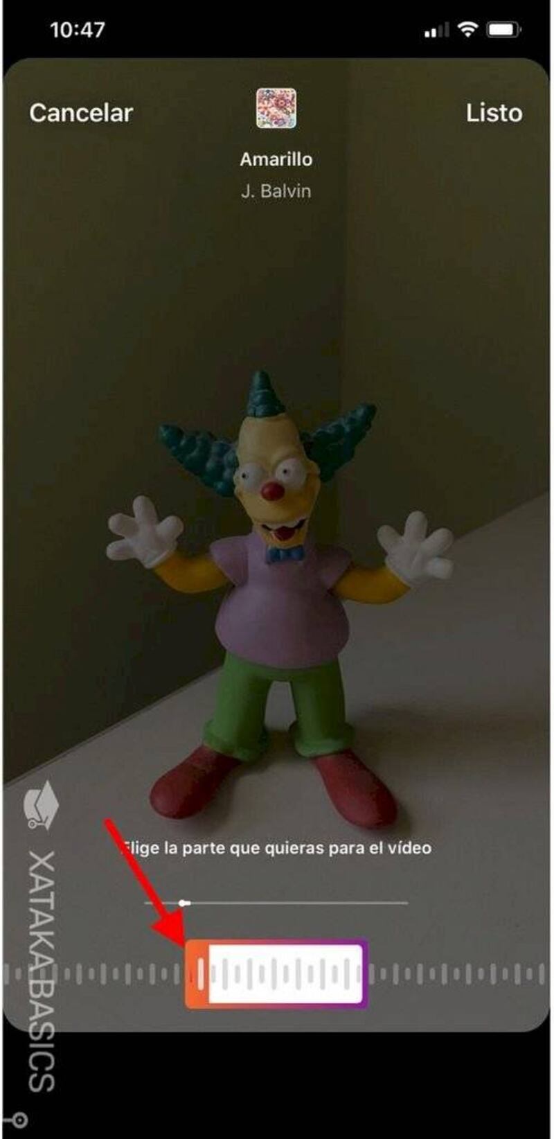 Tras elegir la canción que quieres que acompañe a tu vídeo debes elegir la parte que quieres usar en tu vídeo usando los selectores para el inicio y el final del recorte. Cuando tengas seleccionado un fragmento que te guste, pulsa Listo.