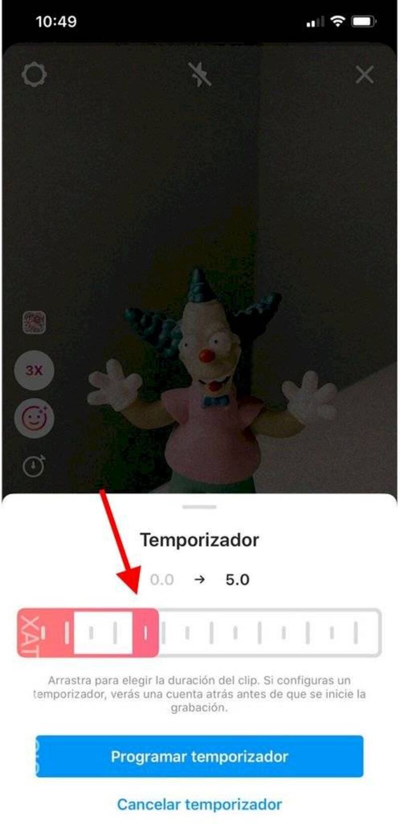 La última herramienta de Instagram Reels dobla funciones como duración máxima del clip de vídeo y temporizador. Si quieres controlar cuándo empieza y cuándo termina de grabar tu vídeo, toca en el icono del reloj.
